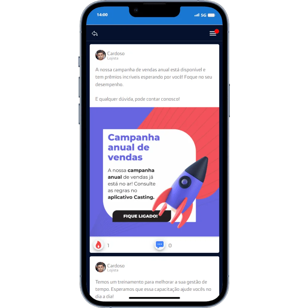 Construímos um um feed contínuo, como já utilizado pelos aplicativos de rede social e de conhecimento comum, padronizando, simplificando e unificando a comunicação com seu time de vendas. Quando se disponibiliza um processo idêntico ao já utilizado no dia a dia, mas com uma visão corporativa, traz a todos a possibilidade de comunicar, interagir, dar sua opinião, o que interfere diretamente no engajamento e na produtividade.